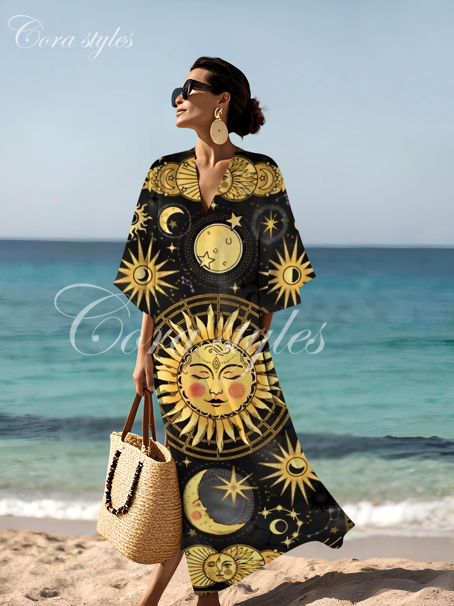 Our premium women's kaftan is carefully crafted from high-quality cotton, linen and polyester blends to bring you the ultimate comfort and effortless elegance. Premium Fabric: Made of breathable cotton and linen blend, it is lightweight and soft for all-day wear. Fashion Print: Embellished with chic and fashionable patterns, it is suitable for any occasion.V-neck Design: The charming V-neck design adds sophistication and elegance. Loose Fit: Smooth and flowing, it allows for ease of movement, and the loose silhouette is suitable for all body types.