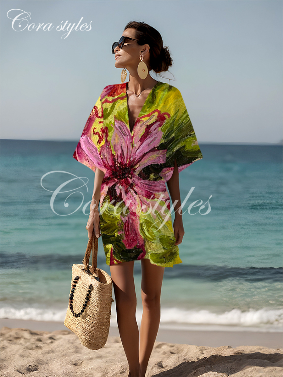 Summer Vacation Printed Cotton and Linen Women's V-Neck Short Skirt