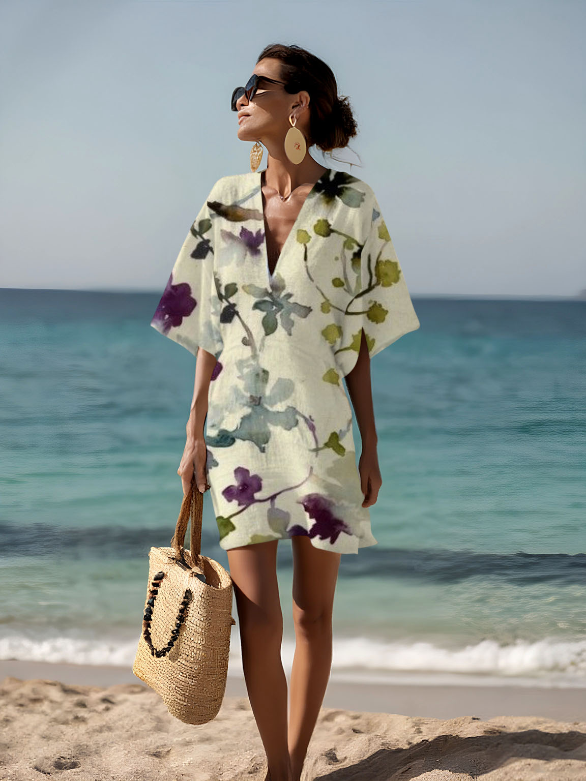 Summer Vacation Printed Cotton and Linen Women's V-Neck Short Skirt