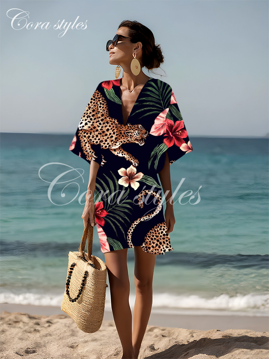 Summer Vacation Printed Cotton and Linen Women's V-Neck Short Skirt