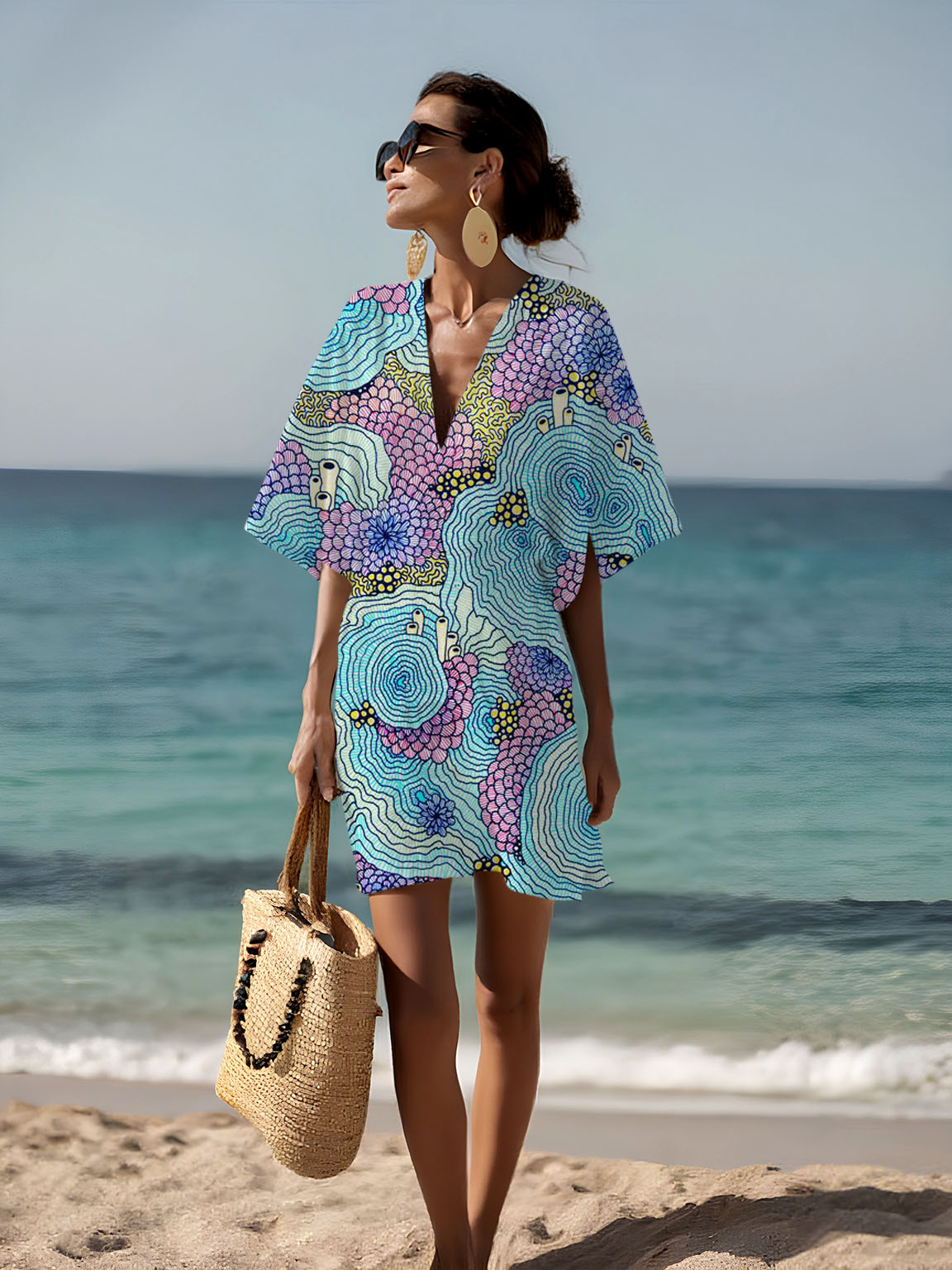 Summer Vacation Printed Cotton and Linen Women's V-Neck Short Skirt