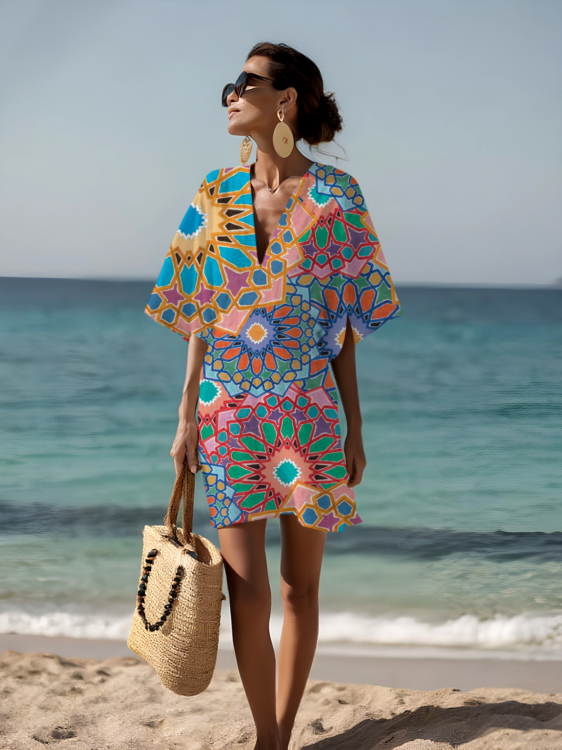 Summer Vacation Printed Cotton and Linen Women's V-Neck Short Skirt