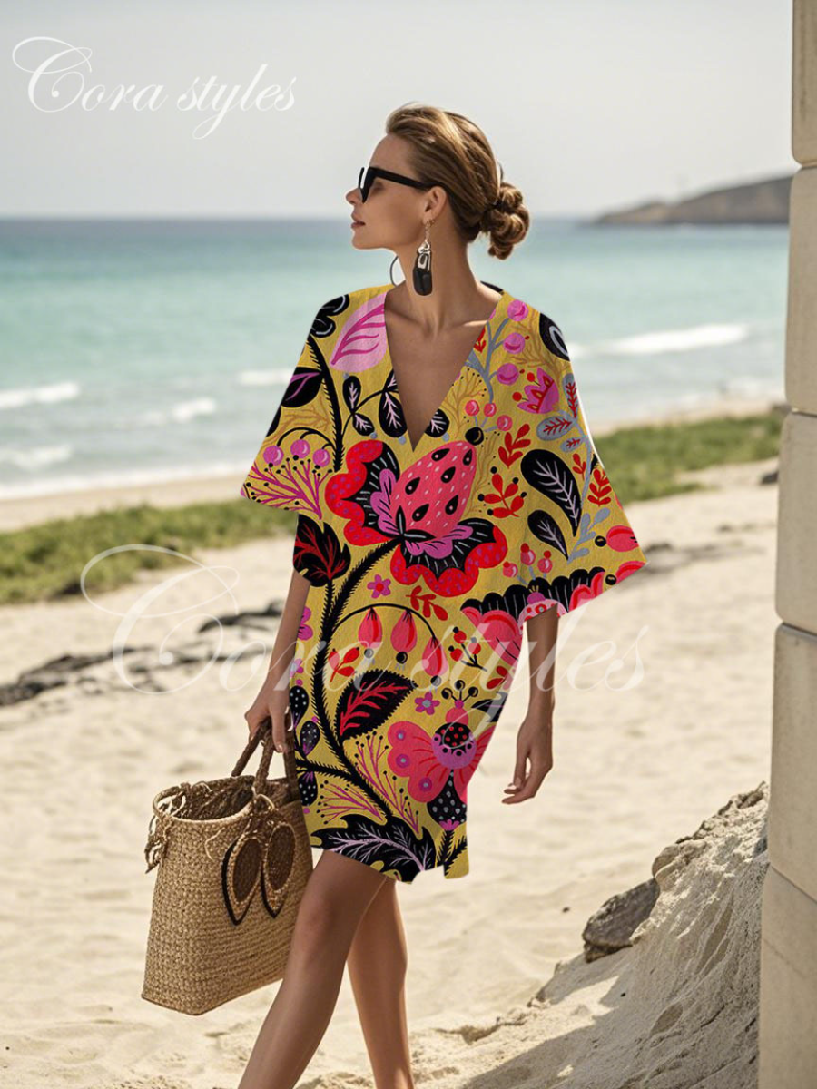 Summer Vacation Printed Cotton and Linen Women's V-Neck Short Skirt