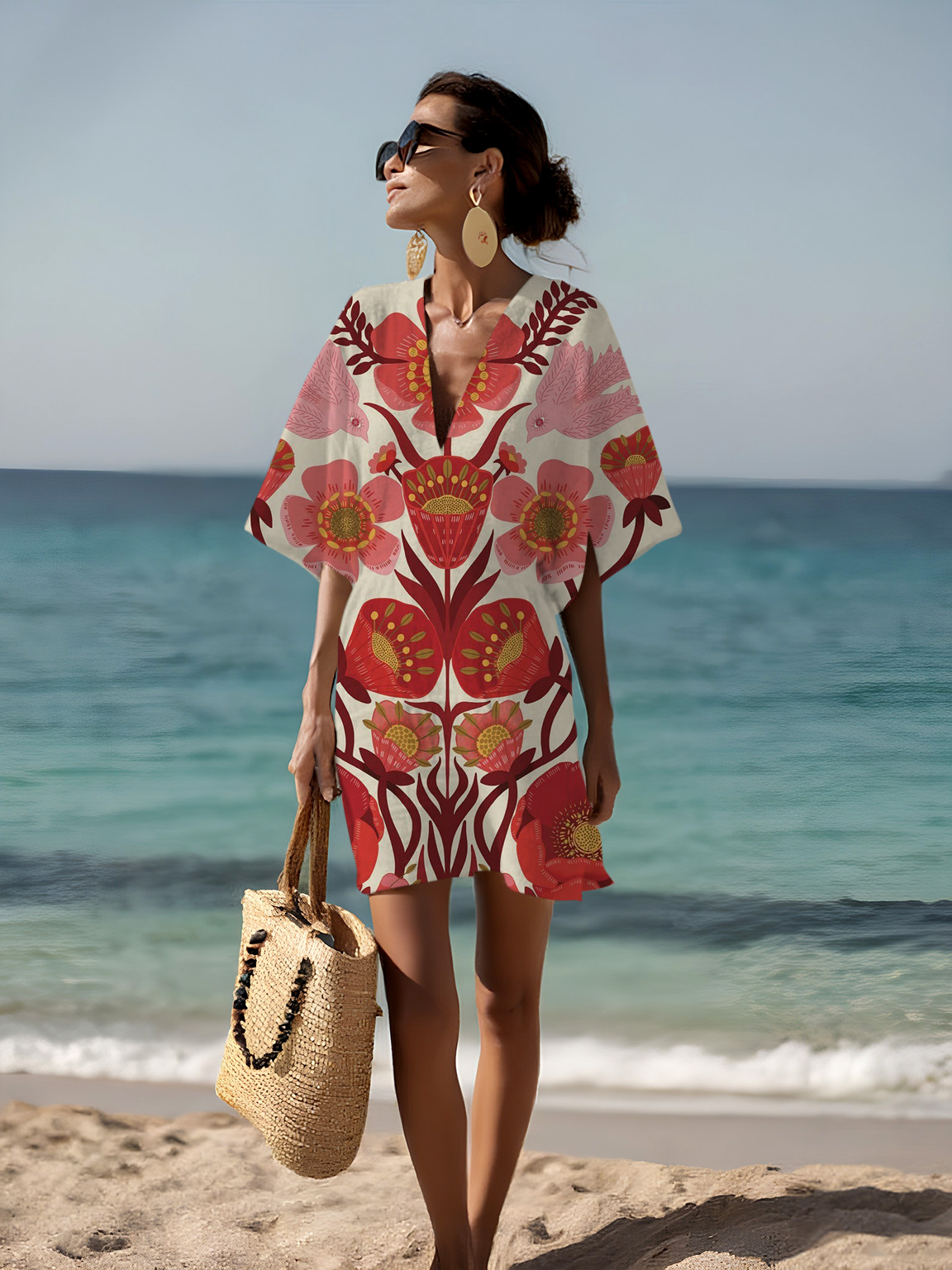 Summer Vacation Printed Cotton and Linen Women's V-Neck Short Skirt