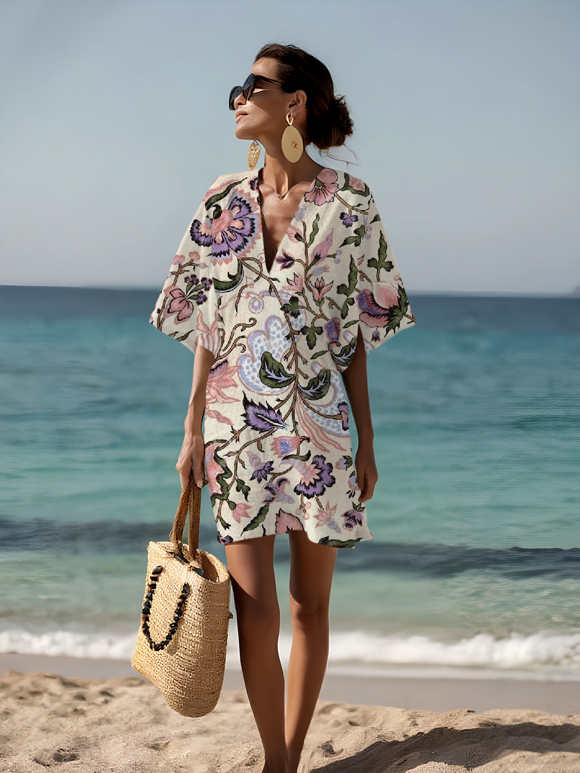 Summer Vacation Printed Cotton and Linen Women's V-Neck Short Skirt