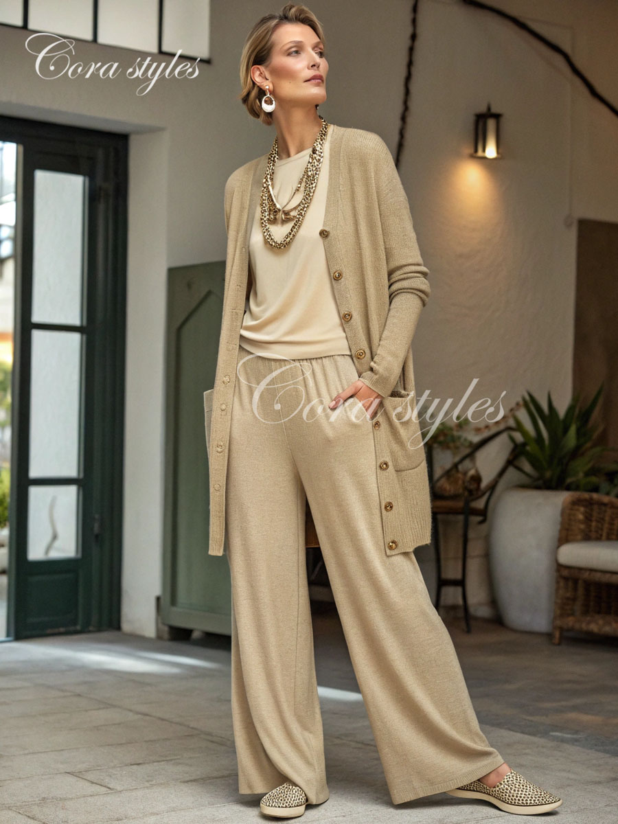 Style: The top features a loose fit, creating a laid-back, effortless look. The matching wide-leg pants offer a sleek silhouette, allowing for easy movement and visually elongating the legs. The entire outfit exudes a relaxed, vacation vibe, combining comfort and style.