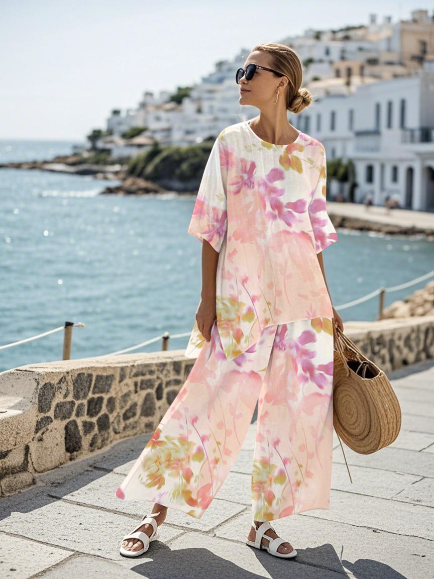 Style: The top is designed with a loose version, which shows a lazy and casual attitude when worn; the matching wide-leg pants have smooth lines, which are convenient for activities and can visually lengthen the leg proportions. The whole set of clothing is full of the relaxed atmosphere of leisure vacation, comfortable and fashionable.
