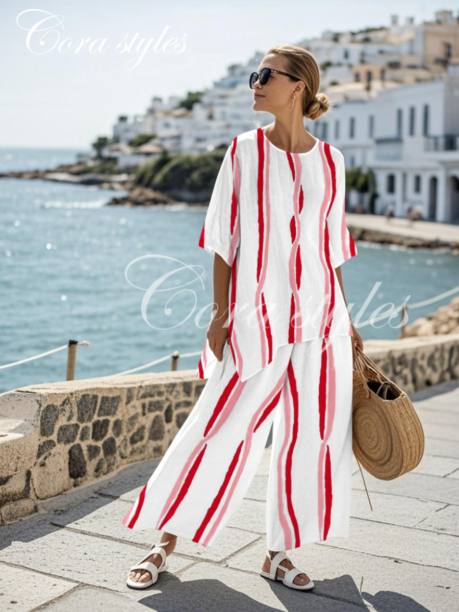 Style: The top is designed with a loose version, which shows a lazy and casual attitude when worn; the matching wide-leg pants have smooth lines, which are convenient for activities and can visually lengthen the leg proportions. The whole set of clothing is full of the relaxed atmosphere of leisure vacation, comfortable and fashionable.
